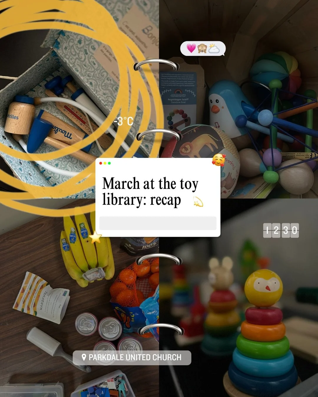 Browse our full collection of 650+ toys in person at our new in-person library at Parkdale United Church, open from 9 a.m. - 12 p.m. every Saturday.